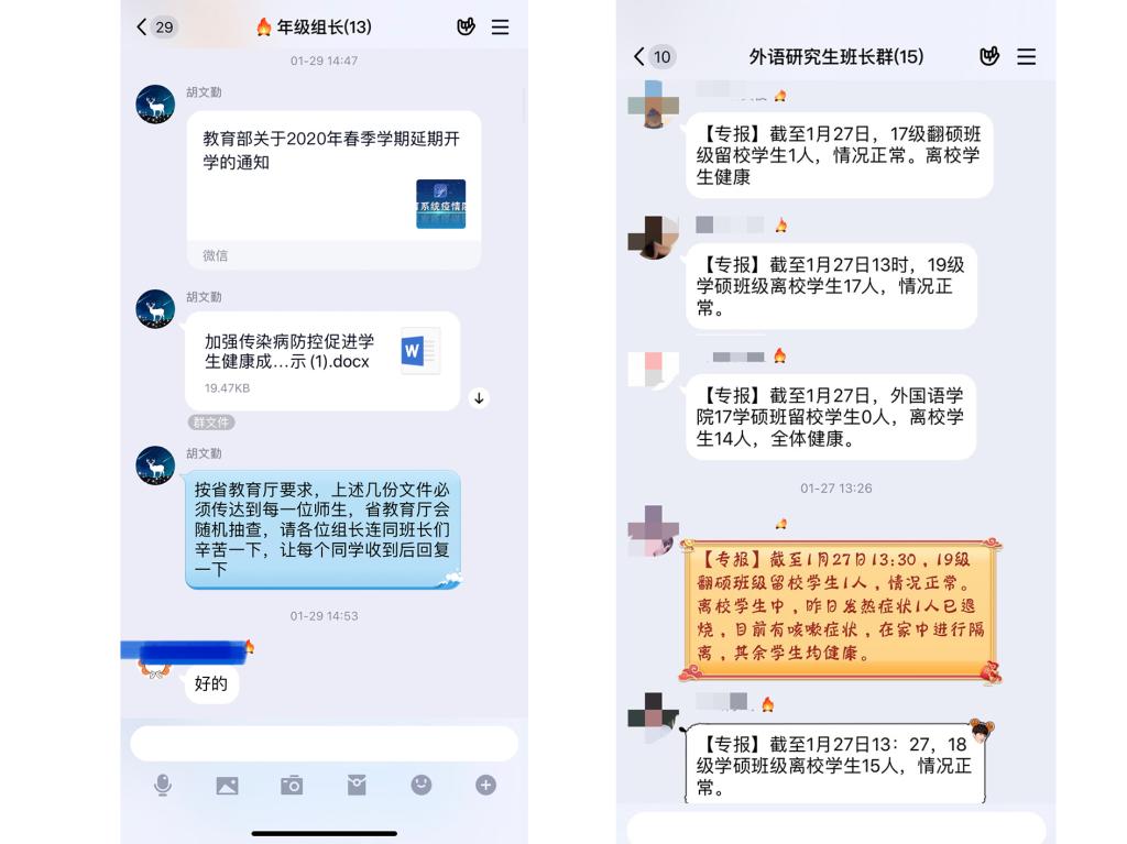 1.落实平安日报制度。1月24日,从一声声“新春快乐,平平安安”开始,91论坛 开始了同学们每天的平安报告,坚持“零报告”制度,做到本研学生100%全覆盖。与此同时,学院辅导员通过年级群、班长群、学务指导和班主任群、学生党员群、家长群等做好疫情防控的引导宣传工作,时时转发科学防疫注意事项以及相关工作通知。