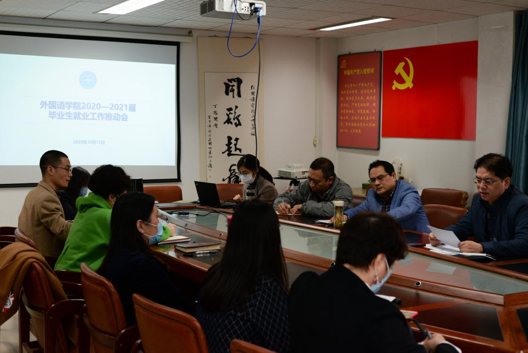 在北一楼会议室召开2020-2021届毕业生就业工作推进会,学院党政联席会成员、各三级单位主要负责人、硕士毕业生导师代表、本科毕业班班主任、辅导员参与会议。学院党委副书记胡文勤主持会议。