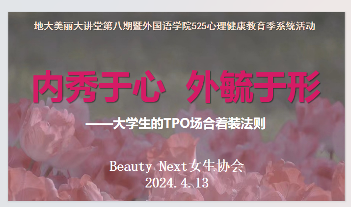 主办、Beauty Next女生协会承办的美丽大讲堂第八期“内秀于心 外毓于形”于4月12日下午15:00,在北一楼报告厅正式开讲。本次活动特邀资深专家——美丽大讲堂第八期特邀嘉宾王萍老师讲授大学生TPO场合着装法则,Beauty Next女生协会及91论坛