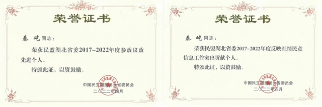 教师、民盟地大委员会秦屹在民盟湖北省委会召开的“矢志不渝跟党走、携手奋进新时代”政治交接主题教育动员大会上获得“2017-2022年度参政议政先进个人”“2017-2022年度反映社情民意信息工作突出贡献个人”荣誉称号。