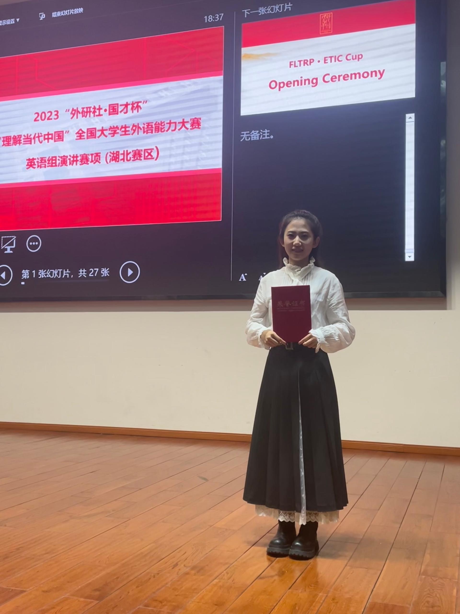 2023“外研社·国才杯”“理解当代中国”全国大学生外语能力大赛旨在引导当代大学生理解当代中国,深刻认识当代中国的发展与成就,向国际社会分享中国改革与发展的经验与智慧。本届演讲赛的湖北省赛分复赛、决赛两轮,大赛包括定题演讲、即兴演讲、评委问答等三个环节,决赛定题演讲主题为“The Chinese Path to Modernization”。