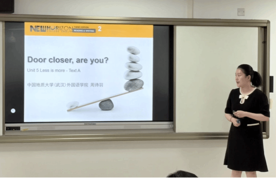 周诗羽老师参赛课程为大学英语读写译课程,抽到的课文为《新视野大学英语读写教程2》第六单元。她在课程设计上以AI赋能的任务型教学法为指导,运用Deepseek讲解语言点,紧扣教材内容制定教学目标和设计教学活动。授课围绕“少即是多”主题展开,融入学术英语写作训练,旨在提升学生语言运用与思辨能力。在课堂教学中融入思政元素,启发学生专注于对国家有益的事情,培养“简单”的幸福感。整场演示环节紧凑,过渡自然,和学生互动氛围热烈,得到了很多现场的积极反馈。