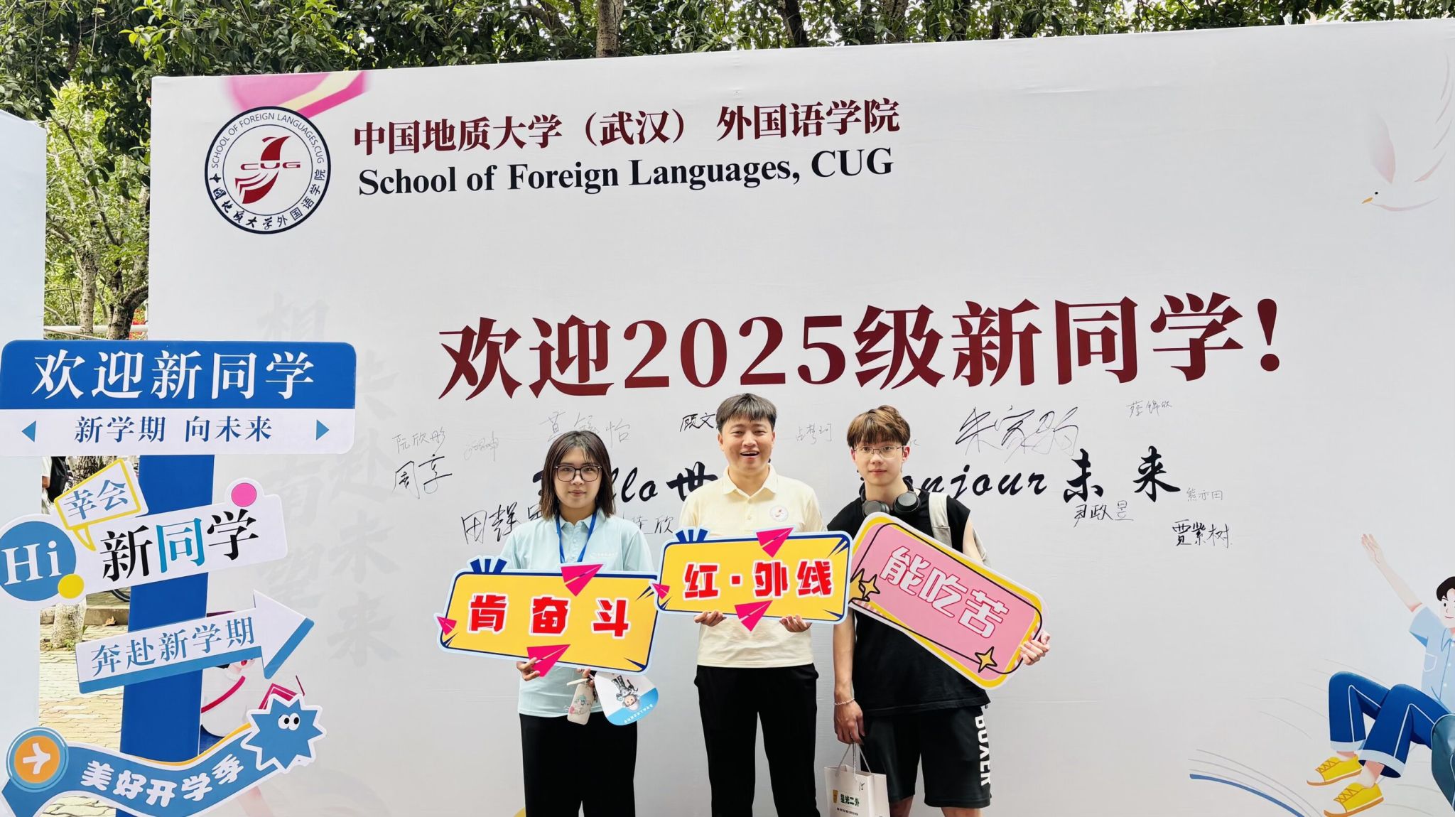 院徽以及学生会自主设计遴选的国风卡通角色——国风语UU,别出心裁!),还有早早在迎新点翘首以盼的志愿者们,无一不在彰显着我们早已做好准备,只为“精准接收”向我们“投送”的外国鱼儿们!